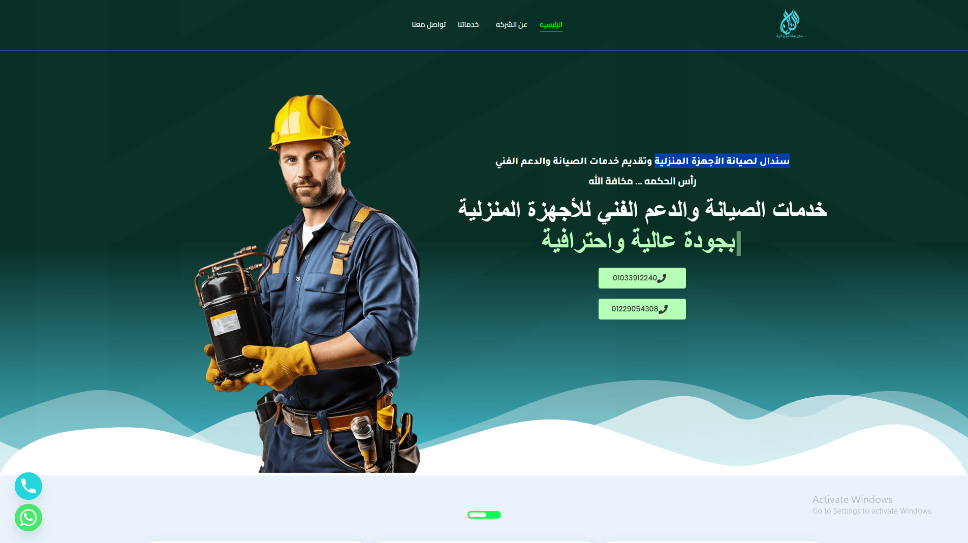 - تصميم عملي وموثوق: واجهة نظيفة، ألوان هادئة مهنية (أزرق + أبيض)، تحميل سريع جدًا، دعم RTL كامل، وتركيز على “24 ساعة – صيانة منزلية – قطع أصلية” كشعار متكرر.