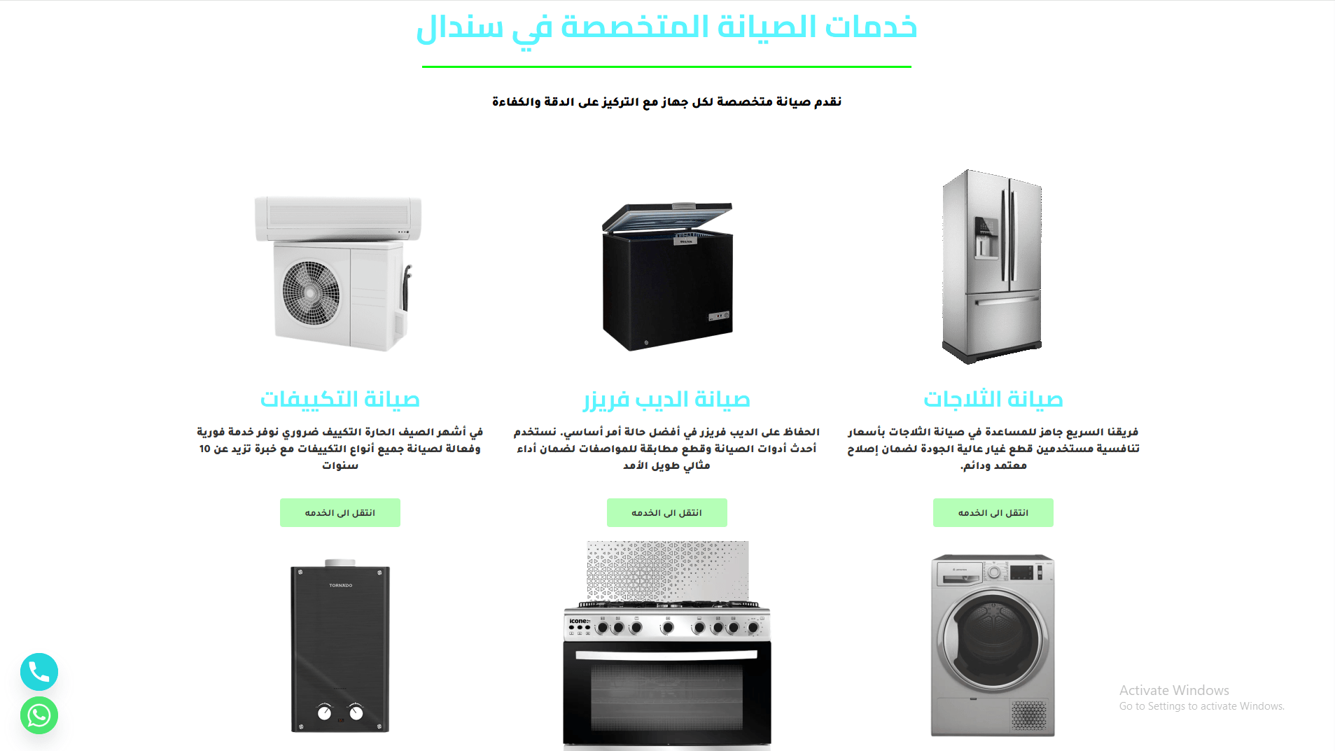 - قسم خدمات مصنف مع أيقونات واضحة: كل جهاز له صفحة خاصة (ثلاجات، تكييفات، غسالات، شاشات…) مع وصف مختصر + ميزات (قطع أصلية، ضمان، صيانة منزلية، استجابة خلال 24 ساعة)، ليفهم العميل الخدمة في ثوانٍ.